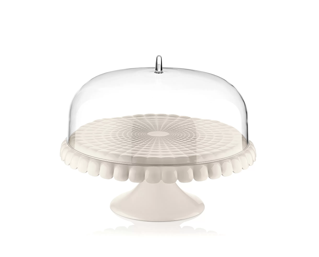Alzata caratterizzata da una base e una campana dalla superficie liscia e dal piatto realizzato con la distintiva lavorazione a quadretti in rilievo di Tiffany.