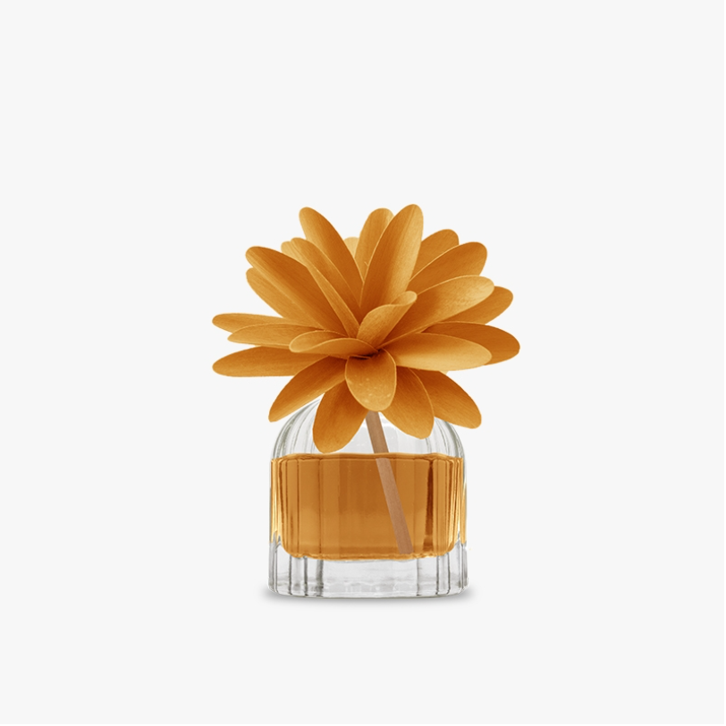 Profumatore d’ambiente in bottiglia di vetro con diffusore a forma di fiore in legno di betulla realizzato a mano. Fragranza CEDRO E BERGAMOTTO